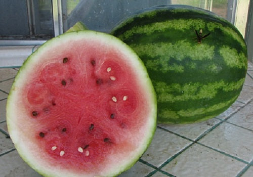 Otherwise they are very similar: round melons, 7 – 12 inches across, with dark green skin and sweet red or pink flesh. Both are favorites at Pueblo feast days. Both also have very thick rinds, so they are good for storing into the winter, or for making watermelon rind pickles. These two varieties of watermelons are available online only.