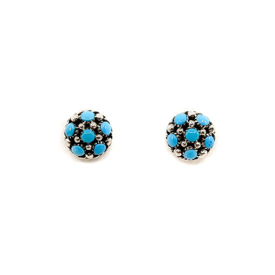 • Handcrafted sterling silver and turquoise petit point stud earrings with rope bezel by Darlene Weebothee
