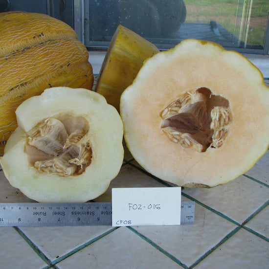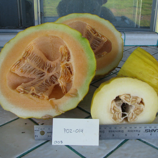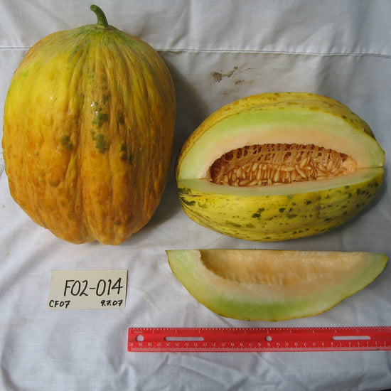 • Cucumis melo. A mix of typical Puebloan melons with a variety of shapes from long, smooth skins to round casaba-types. Some with netting, others with smooth skin. For this and other thin skinned melons, turn the growing melons once a week to keep them from developing a soft spot where they touch the ground.  From our Seed-Bank Collection.