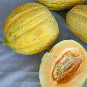• Cucumis melo. Also collected from Santo Domingo Pueblo, these are typical of the "native" melons grown for centuries in the pueblos of New Mexico. The fruit are oblong, ribbed, and have predominantly smooth skin. Some netting or "cracking" occurs. The flesh is orange and tasty.  For this and other thin skinned melons, turn the growing melons once a week to keep them from developing a soft spot where they touch the ground.  From our Seed-Bank Collection.