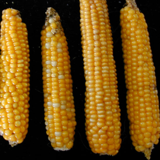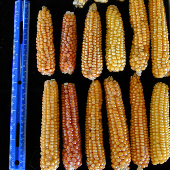 • Zea mays. (Tarahumara Yellow Apachito). Similar to Tsetakame (Tarahumara Apachito) but these kernels are predominantly yellow, with occasional pink or apricot. One of the favorite races grown by the Rarámuri. Apachitos are the fastest maturing Rarámuri corn in the NS/S collection. Short plants. Used for cornmeal, tortillas, atole (a corn based drink), and pink variants are used to prepare tesgüino, a corn beer.  From our Seed Bank Collection.