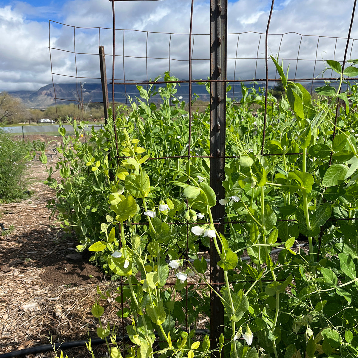 • Pisum sativum. From the Salt River Pima - Maricopa Indian Community in Phoenix, where they are grown in the cool season. The fresh peas are nice and sweet when picked young before the peas fill the pod. The dried peas are good in soups and stews. The large seeds are tan and smooth. Hardy in low desert winters but also performed well in spring at our former farm in Patagonia. From our Seed Bank Collection.