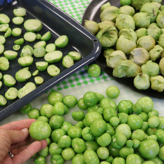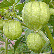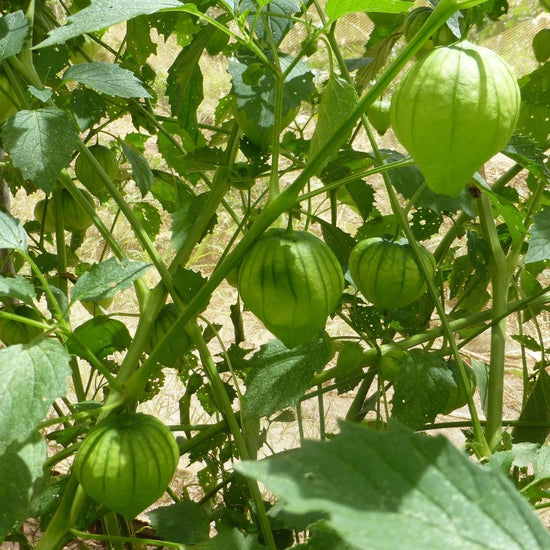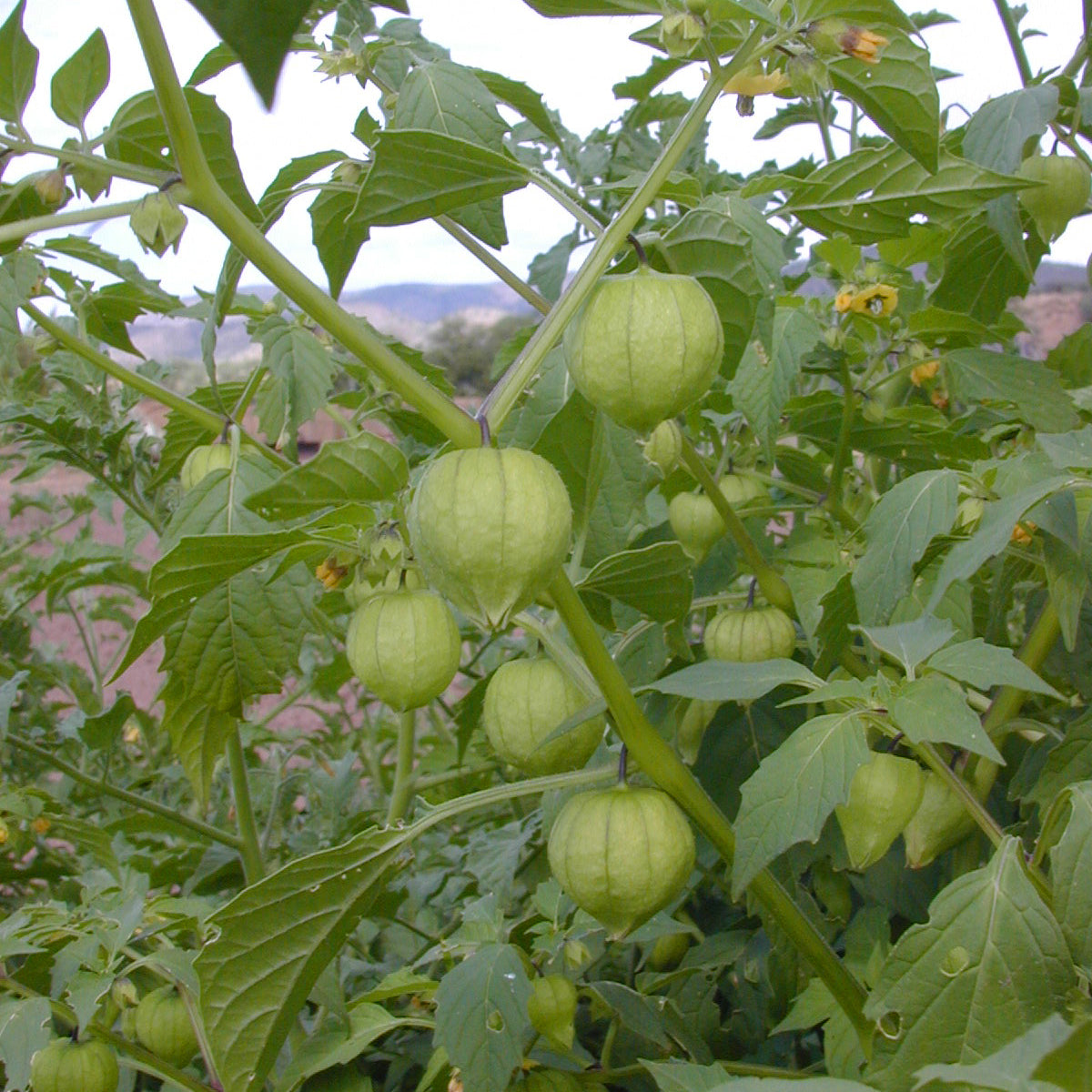 Physalis spp. Tomatillos, "husk tomatoes," are used to make traditional and savory green salsas and stews. Related to ground cherries and Cape gooseberries.