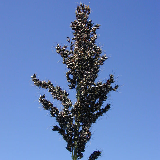 Sorghum bicolor. Originally from Africa. Introduced to the US as a animal forage, grain and sugar source. The prolific plants are heat and drought tolerant. Stalks are chewed for their sweet juices. An excellent warm-weather cover crop to renew tired soils in arid regions. Deep roots can till compacted soil and introduce organic matter. Approx. 2g/75 seeds per packet.