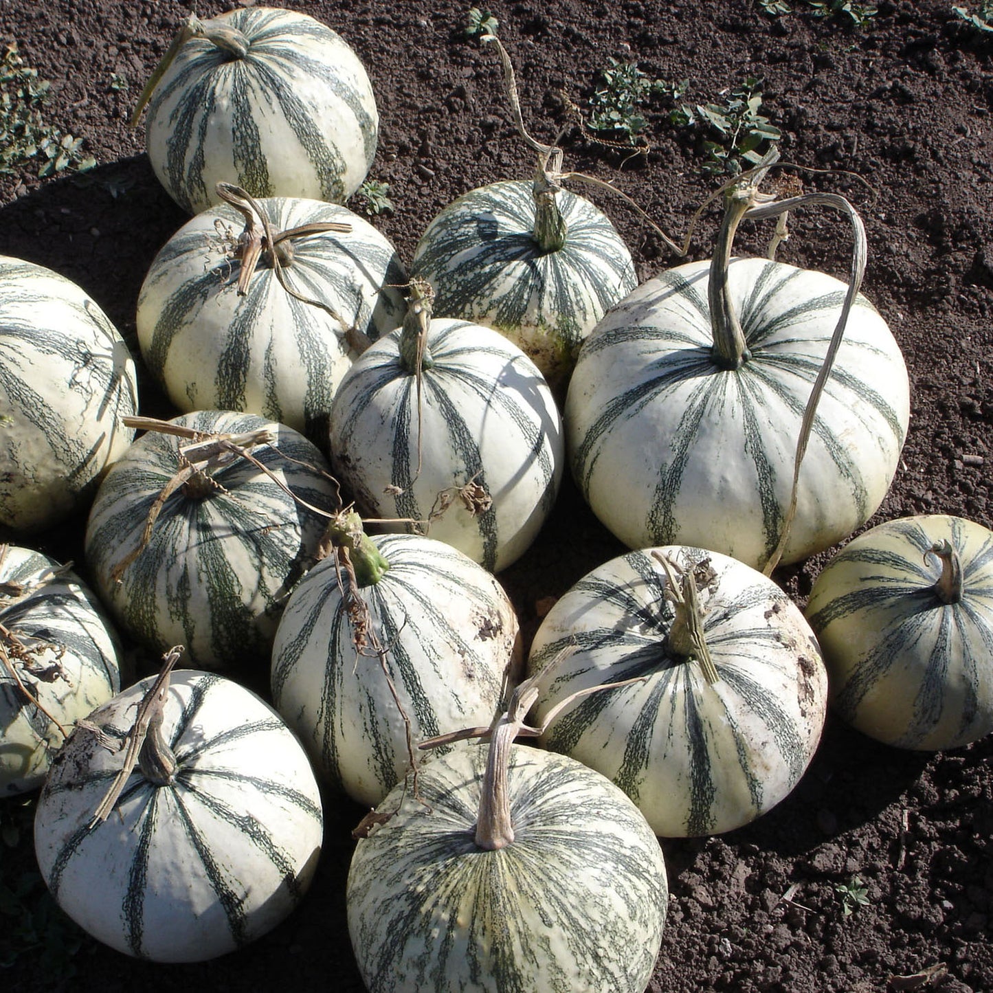 Cucurbita argyrosperma. Striped cushaw-type fruit. Squash fruits vary in shape, color and flavor. Flowers, seeds and growing tips of vines are all edible. All fruits can be eaten when small and immature as summer squash, and mature as winter squash. The fast-growing vines have large splotched leaves. Characteristic peduncles are large and corky. The fruits of this species usually have a long storage life. Approx. 4.5g/15 seeds per packet.