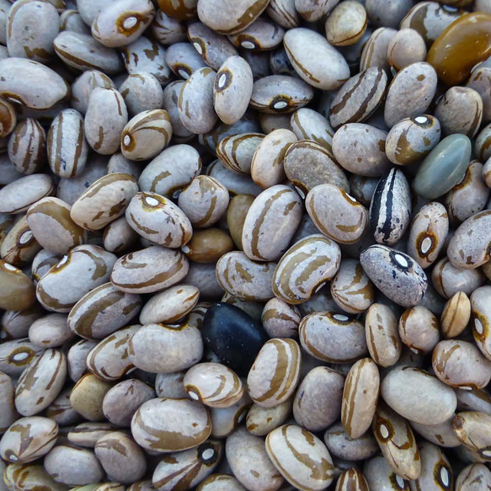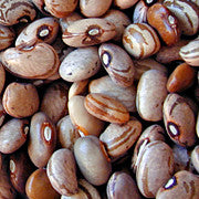 • Phaseolus vulgaris. (Tarahumara Ojo de Cabra). "Goat's Eye." A sweet, mild staple of the Sierra Madre. High-yielding pole bean producing large seeds with diversely-colored dark stripes over a speckled light background. Occasional red, pinto, or gold beans mixed in. Plant produces purple-striped pods. From our Seed Bank Collection.