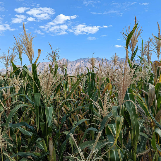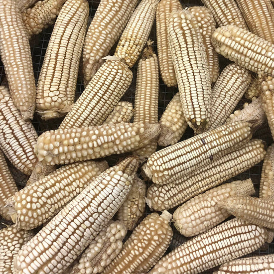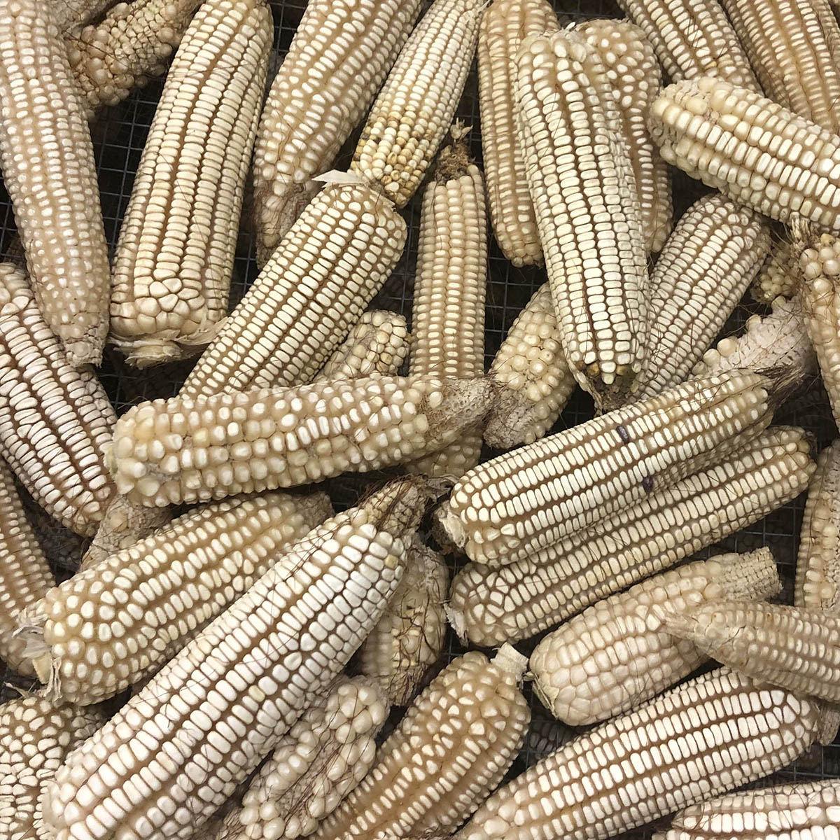• Zea mays.  aka Tohono O'odham June Corn.  Traditionally floodwater farmed in midsummer with the desert rains.  The sturdy plants grow to 8', with some red on stalks, silks and tassels.  Dented clear/white kernels with a hint of pink and soft, floury centers.  Ears to about 7".  Good for elotes, or nixtamalize the kernels for tamales or tortillas.  Originally collected in 1981 on the Tohono O'odham reservation.