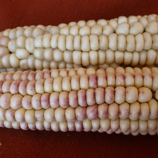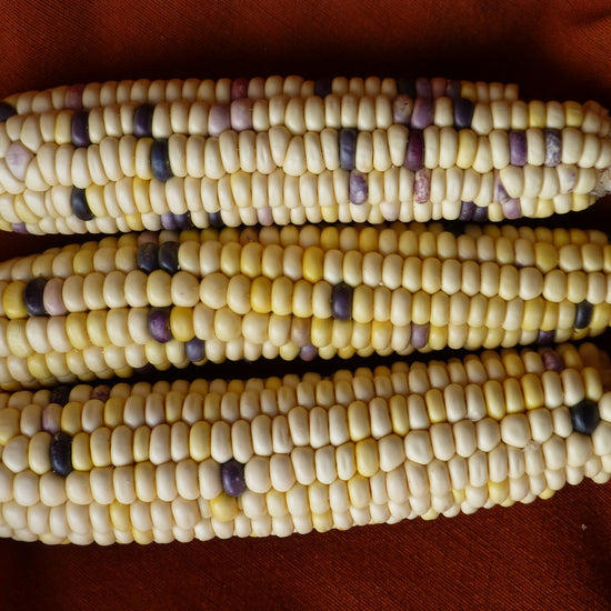 • Zea mays. Rarámuri Gordo (Tarahumara Gordo). Fat kernels, predominantly white with a few yellow, purple or blue/white speckled kernels. An all purpose corn, primarily ground into flour but kernels also used for pozole. From our Seed Bank Collection.