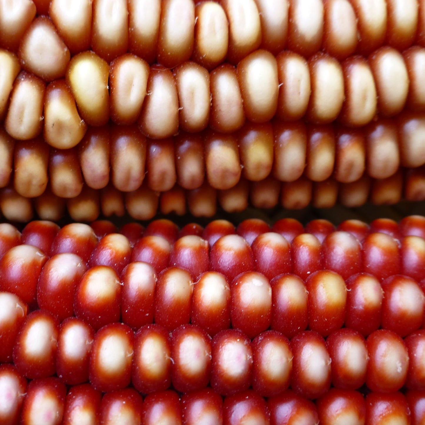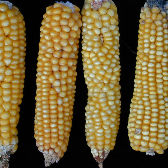 • Zea mays. Rarámuri Serrano (Tarahumara Serrano).  Small, cone-shaped ears from the Rarámuri highlands.  Mostly white kernels but also some ears with orange sides and white "caps."  From our Seed Bank Collection.