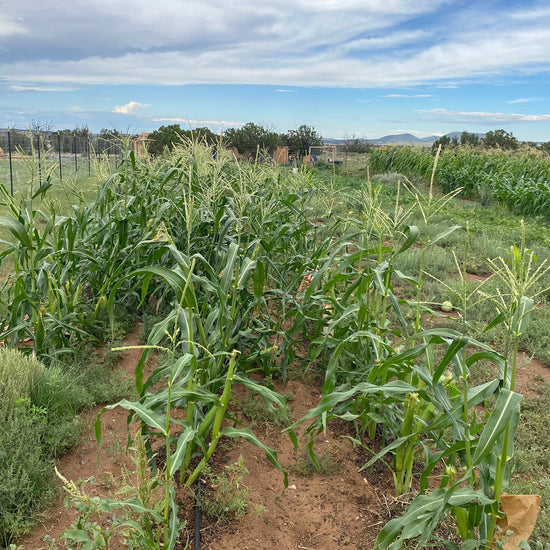• Zea mays.  This is a concho-type corn, traditionally used for making chicos or for posole or tortillas.  Flinty pearl-white kernels on 6-8" ears, with occasional pink-tinged kernels; The 3-5' stalks are tolerant of cool, high elevations. From the Jicarilla Apache reservation in New Mexico.  From our Seed Bank Collection.